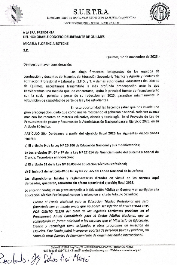 A través de sus equipos técnicos y territoriales, SUETRA continúa interviniendo ante autoridades municipales para manifestar posición respecto al Artículo 30 del Proyecto de Ley de Presupuesto Nacional 2026 de la administración nacional que prevé, entre otros, la derogación del fondo de financiamiento de la Educación Técnico Profesional.
